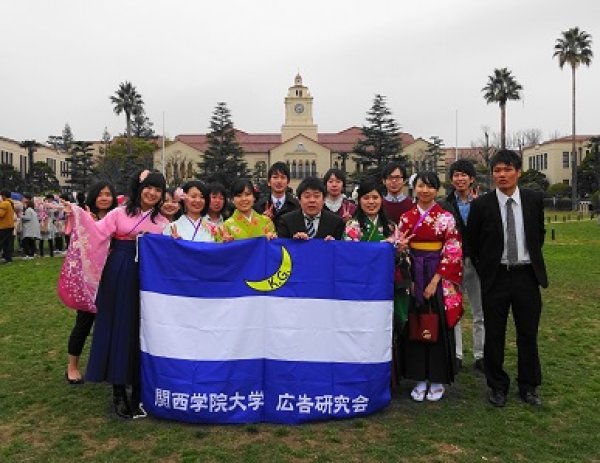 式後の写真撮影時になって雨が降り始めたことや、現役生卒業生ともに全員そろわなかったことは少し残念でしたが、広告研究会の旗を持った卒業生の皆さんと時計台をバックに記念撮影できたことはとても嬉しかったです。