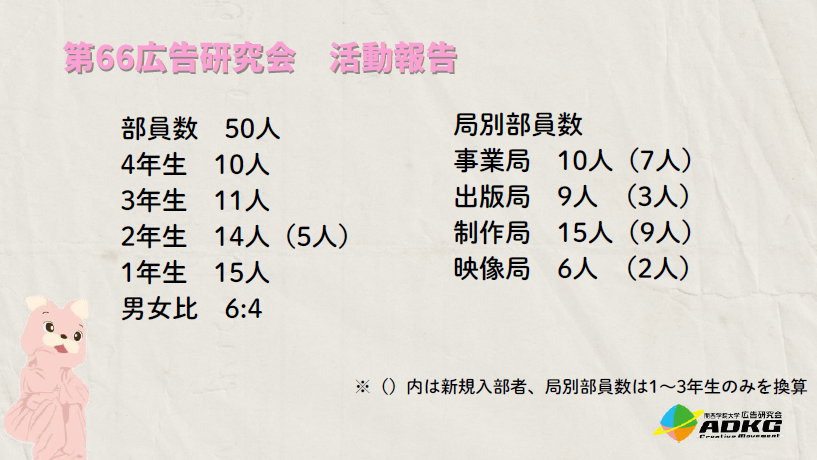 第66代広告研究会の活動報告をOBOG連絡委員の岩下さんから実施