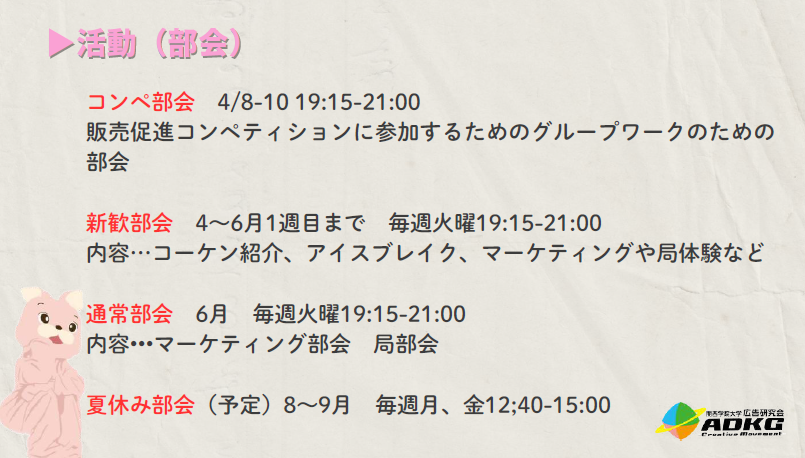 ・新歓部会(4~6月広研紹介やマーケティング、局体験など)